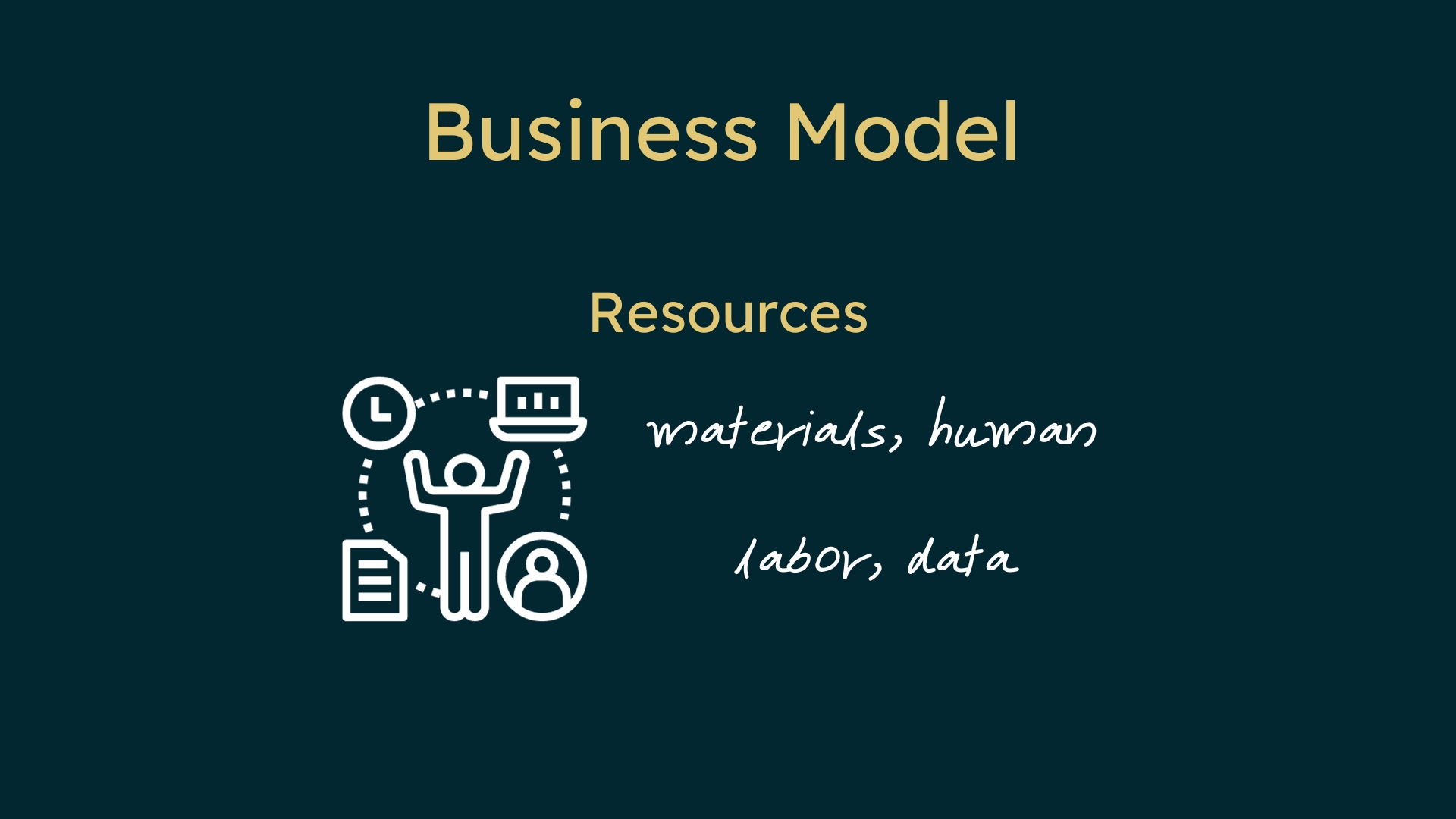 - Resources: Something of value the company uses to create a product or service, like physical materials, human labor, data, brands, etc.