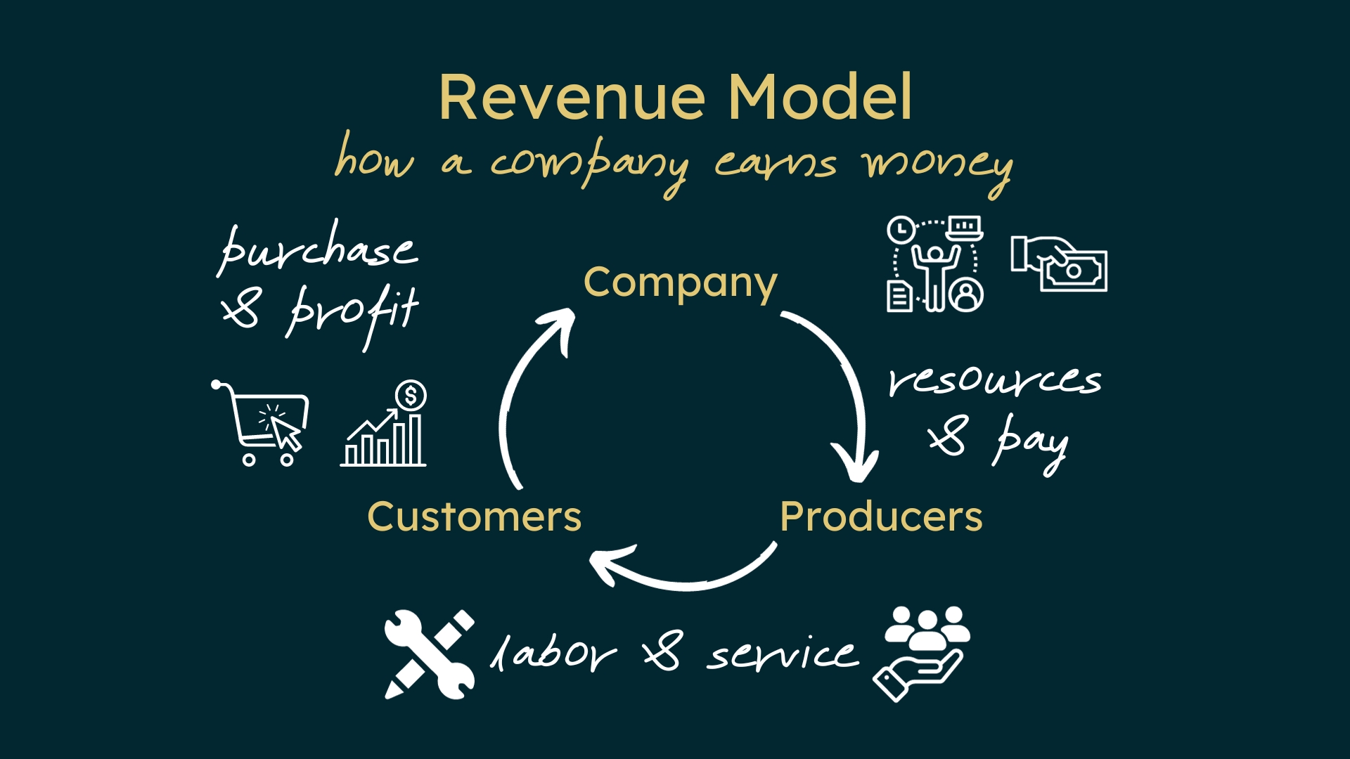 Letβs say we own a business that sells customers cups of tea as a product/service. Resources would include tea leaves, spices, and cups. The producers are the tea farmers and makers. Revenue comes from direct tea sales.