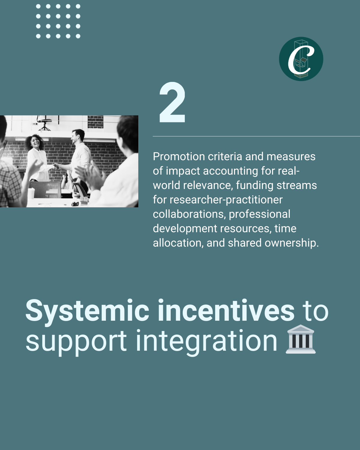 - Institutions allocate dedicated time for researchers to engage with practitioners