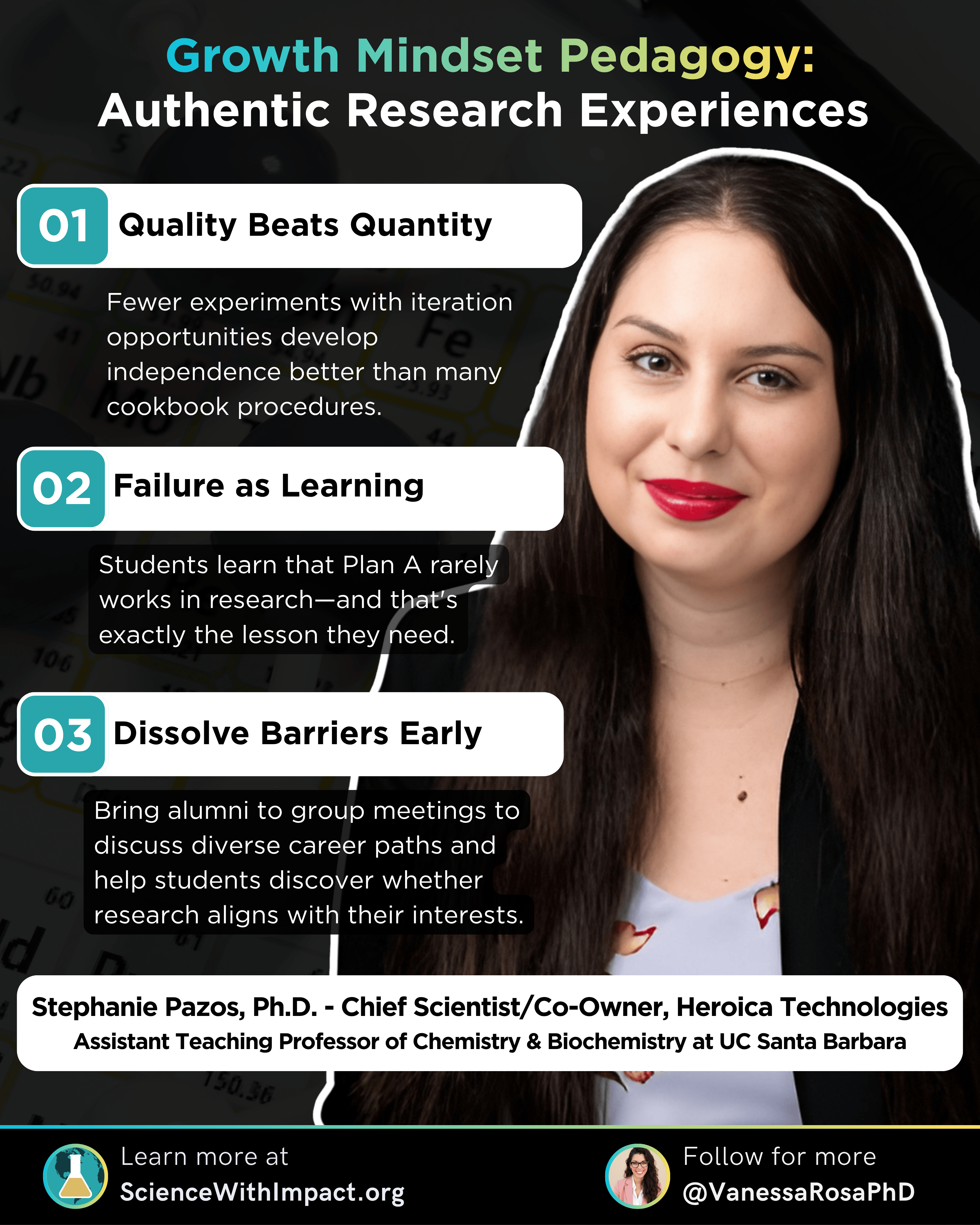 "I learn a lot more from my failures than when something works," Dr. Pazos shared. Her Guinea Pig approach normalizes experimental failure as data, not defeat. Students learn that Plan A rarely works in research—and that's precisely the lesson they need before entering research labs or graduate programs.