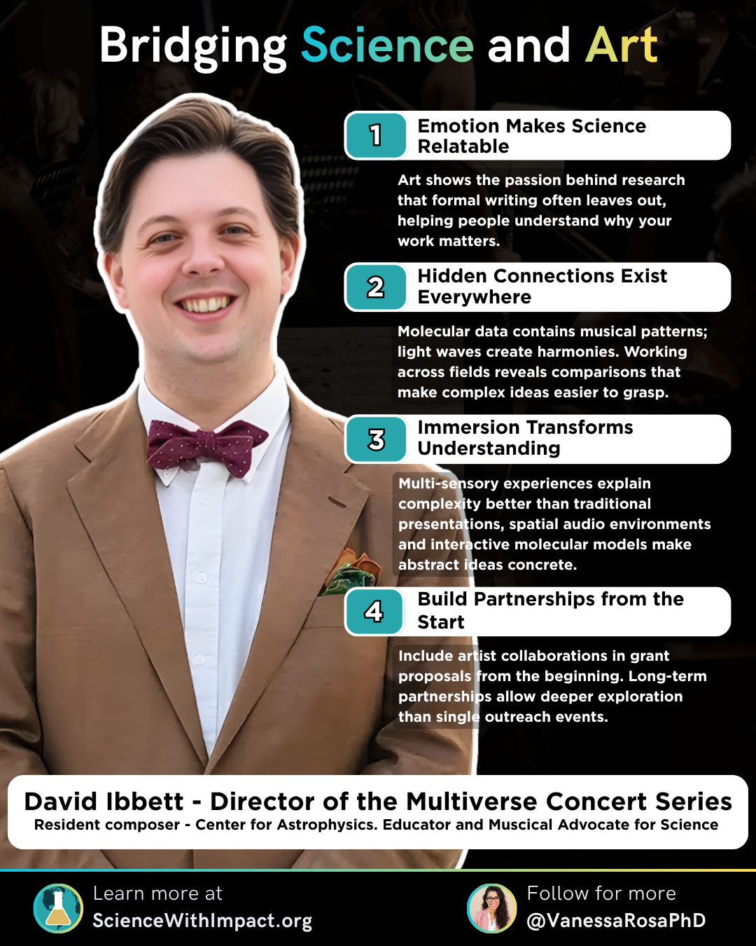Professor David Ibbett's work with the Multiverse Concert Series reveals a powerful truth: the most effective science communication happens when we stop treating art and science as separate domains and instead recognize them as complementary ways of understanding our world. By transforming polymer networks into orchestral scores, Mars rover data into spatial soundscapes, and molecular structures into interactive games, David demonstrates that complex research becomes not just accessible but emotionally resonant when experienced through multiple senses.
