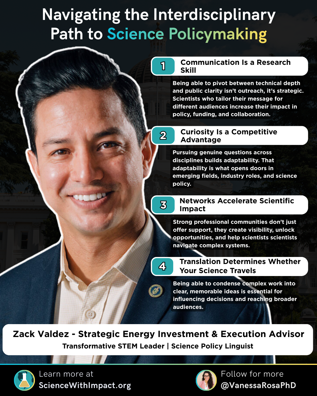 Thank you to Dr. Zack Valdez for sharing his insights on navigating interdisciplinary paths and translating scientific expertise across sectors. His career demonstrates that meaningful impact often comes not from the next publication, but from learning to communicate your work in ways that resonate with policymakers, industry leaders, and communities who can benefit from your research.