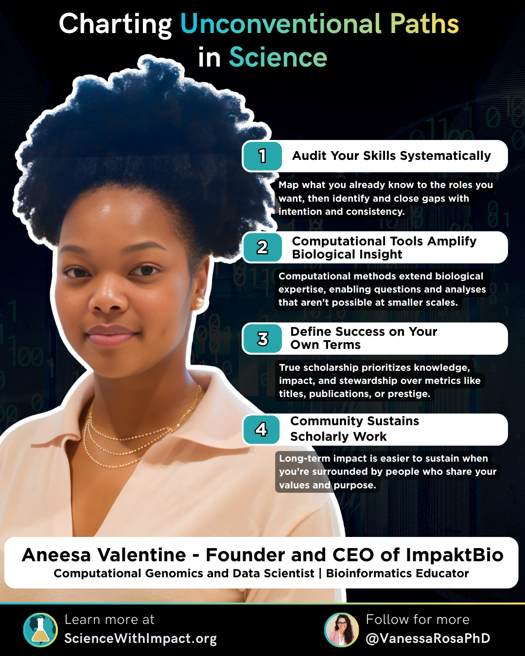 Aneesa Valentine's journey from computational genomics PhD student to founder of ImpaktBio reveals a powerful truth: you don't need to follow a traditional path to build a meaningful scientific career.