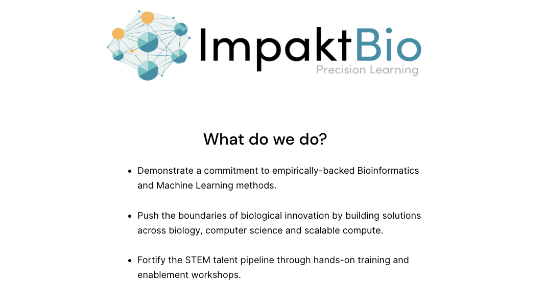 ImpaktBio emerged from a simple observation: researchers across biology increasingly need to work with complex genomic datasets, yet most lack formal training in the computational tools required to analyze them effectively. The company fills this gap by providing practical instruction in Python, R, single-cell analysis pipelines, and cloud computing platforms to researchers who need these skills but can't pause their careers for formal computer science degrees.