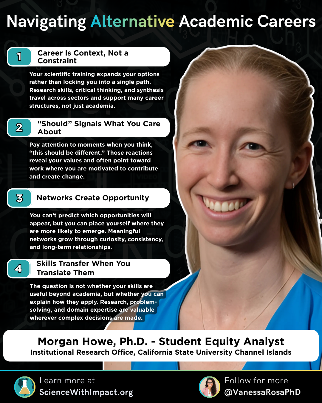 Thank you to Dr. Morgan Howe for sharing her honest reflections on building a fulfilling career in science that honors both professional expertise and personal wellbeing. Her story demonstrates that meaningful impact comes in many forms—including the quiet work of improving systems that directly affect students navigating higher education.