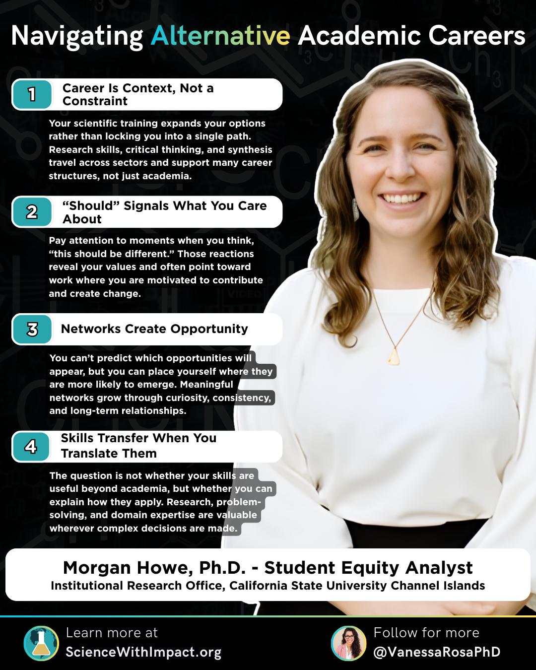 Melissa is a postdoctoral researcher in chemistry education at Auburn University and the co-host of the Chemistry For Your Life Podcast, where she helps make chemistry accessible to broad, nontraditional audiences. Her career journey offers a clear-eyed look at why many research scientists begin to question the tenure-track path—and how applying scientific thinking to career design can open new, sustainable routes for impact.